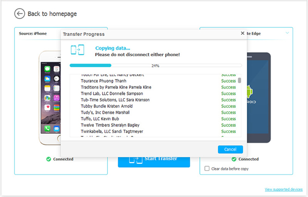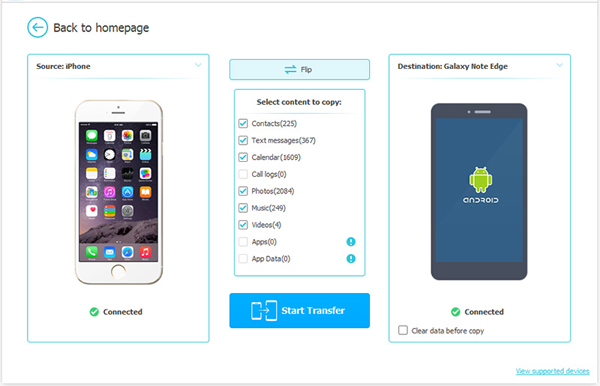 第三——之後,您可以預覽主界面並選擇要切換的數據,然後單擊“開始復制”以在兩部手機之間移動數據。可傳輸的文件包括聯繫人、通話記錄、消息、照片、音樂/歌曲和視頻等。您可以選擇您想要的文件。