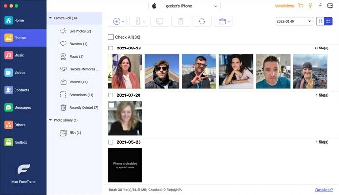步驟3:選擇您要在 Mac 上訪問的文件類別,例如,照片。然後軟件的主界面將顯示您iPhone中的所有照片。