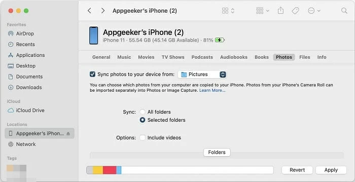 步驟6:要將文件從 Mac 複製到 iPhone,請在 Mac 硬盤上找到該文件,然後將其拖放到 iPhone 上 Finder 窗口中的所需文件夾中。