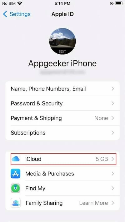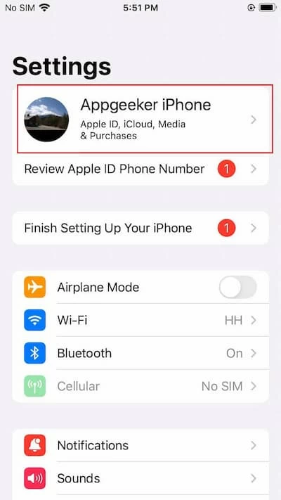 步驟2:在您的 iPhone 上,轉至設定並點擊您的蘋果ID在屏幕頂部。