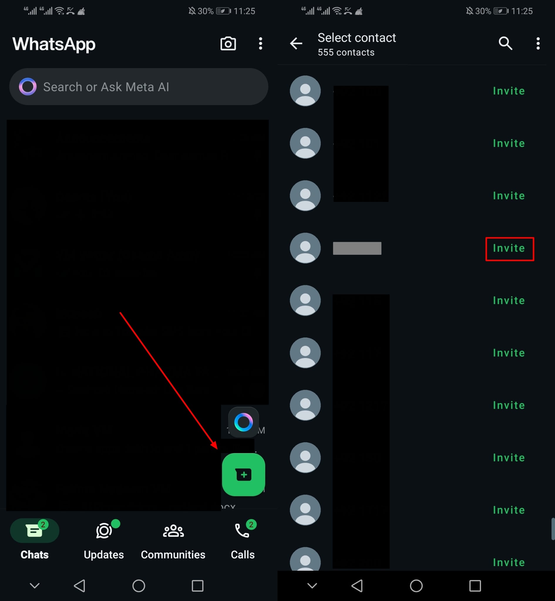 指示:打開應用程序並導航至您的聯繫人列表。訪問它後,滾動到底部即可查找 WhatsApp 上沒有的號碼。現在,點擊他們姓名旁邊的“邀請”即可向他們發送邀請。