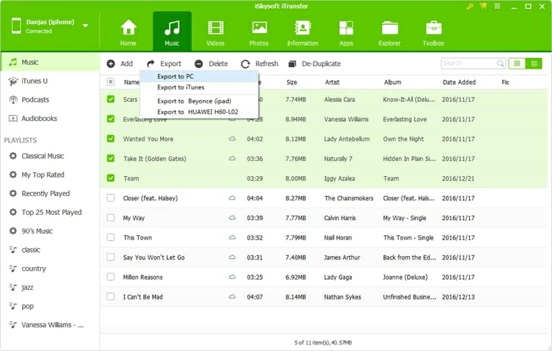 從音樂列表中,選擇要備份到計算機上的音樂文件。之後,單擊“導出到 PC”即可開始在沒有 iTunes 的情況下備份 iPhone 的過程。