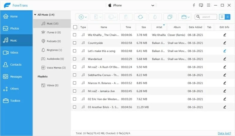 您可以在工具的左側欄看到一些選項卡,包括音樂、視頻、聯繫人、消息等。您可以隨意選擇您要備份的數據。這裡我們以音樂文件為例。單擊“音樂”按鈕,該工具應該會加載 iPhone 中的所有音樂文件,如下面的屏幕截圖所示。