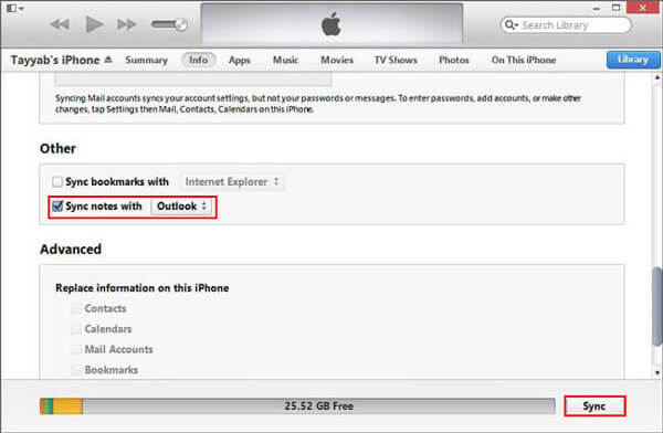 左側有一個信息部分iTunes面板,您可以在 Outlook 的幫助下同步您的 iPhone。保存的 iPhone 筆記將位於 Outlook 的文件夾中。