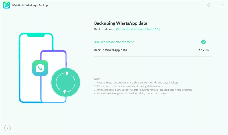 步驟 4。現在該程序將開始分析設備環境並開始備份 WhatsApp 數據的過程。