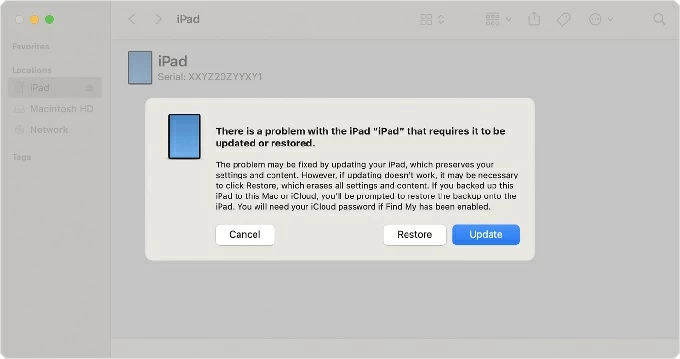 步驟5。彈出一個對話框,提醒您的iPad需要還原或更新。要繞過iPad的鎖定屏幕密碼,請選擇恢復選項。如果什麼都沒發生,您需要先找到iPad。