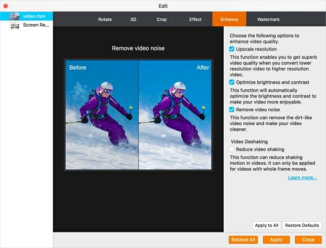在窗口的工具欄上,有一個標記為“編輯”的按鈕。單擊它,您將獲得一整套消費者級編輯工具:旋轉、3D、裁剪、效果、增強和水印。嘗試這樣做,讓您的視頻看起來更令人印象深刻。