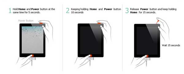 - 按住“電源”和“主頁”按鈕約 10 秒鐘,將 iPad 啟動至 DFU 模式。