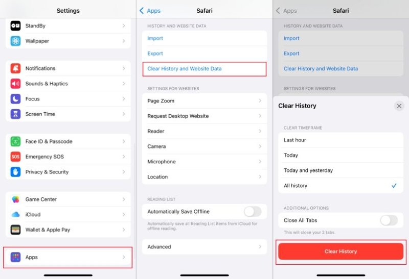 第 6 步:在“設置”中,選擇“Safari”。之後,點擊“清除歷史記錄和網站數據”。點擊“清除歷史記錄”。
