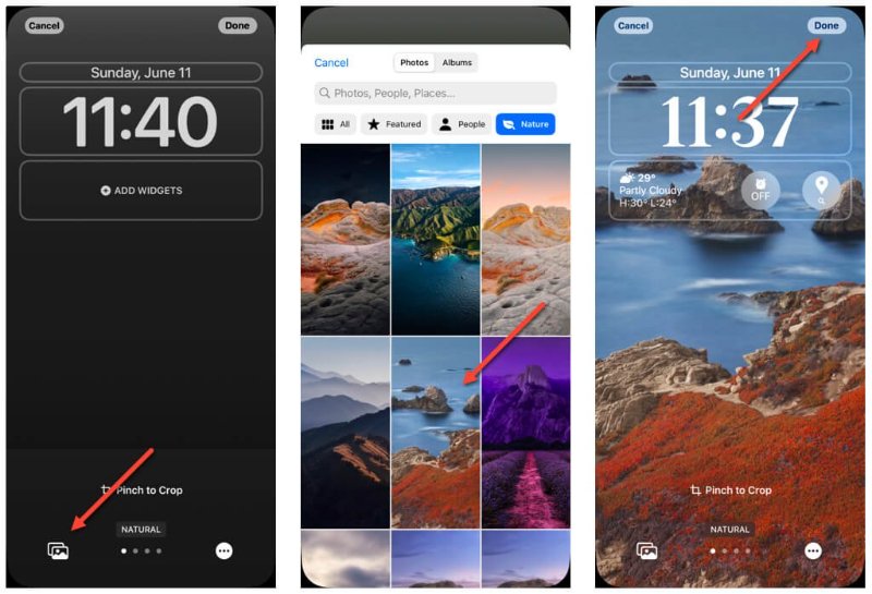 第 2 步:點擊“照片”。選擇一張新照片作為壁紙,然後縮放、裁剪或添加濾鏡。點擊“完成”。