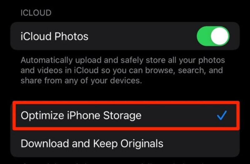 第四步:在“設置”中,選擇“照片”。然後,打開“優化 iPhone 存儲空間”。這樣可以通過在設備上保留較小的照片版本來節省空間。