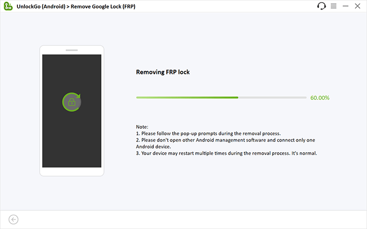步驟3Unlockgo Android將開始從您的設備中刪除Google鎖定。在此過程中,手機可以重新啟動幾次是正常的。