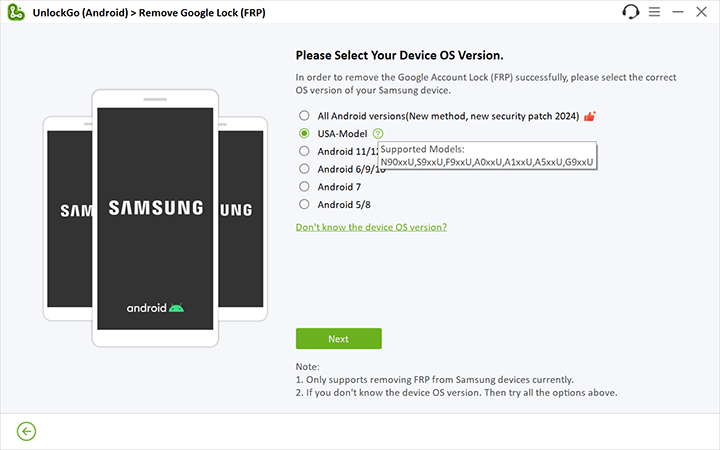 步驟2這些工具提供了幾種繞過三星FRP的選項。如果您擁有三星美國型號,請選擇此選項以確保兼容性。