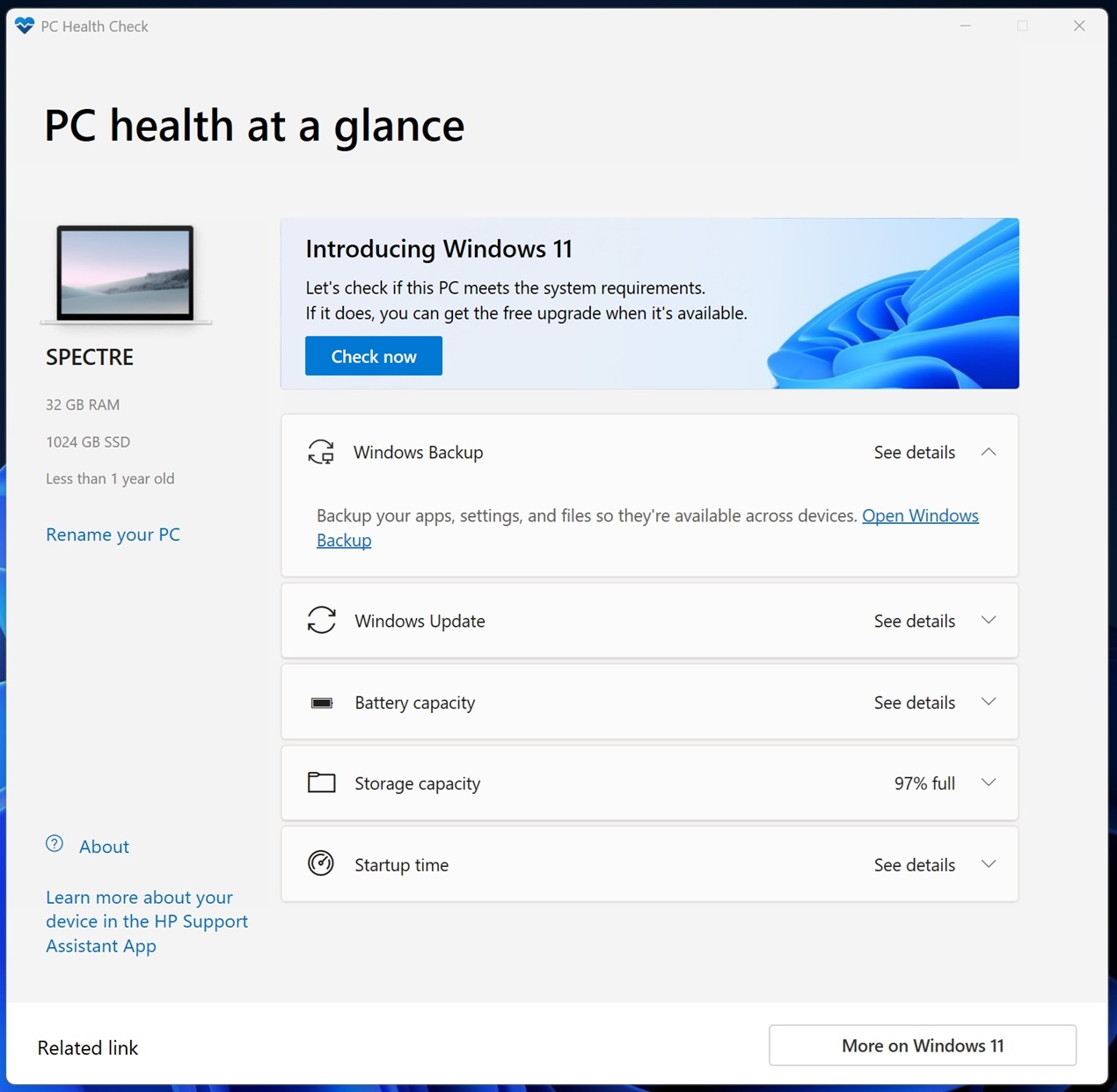 - 打開電腦健康檢查並單擊“立即檢查”。這將執行快速系統要求檢查,耗時不到 20 秒。