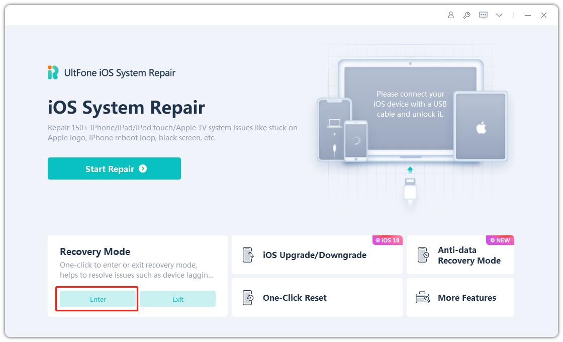 如果您想要一個簡單安全的方法,我們強烈建議使用UltFone iOS系統修復它可以一鍵將您的iPhone置於恢復模式,修復超過150個問題,並避免數據丟失。下次您的 iPhone 出現問題時,您將確切地知道如何將 iPhone 17 Pro Max 置於恢復模式或輕鬆修復它。