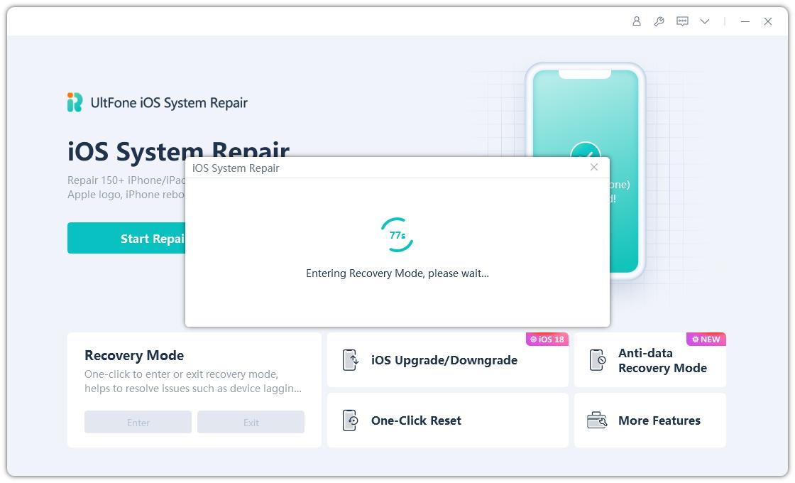 有時,您的 iPhone 17 恢復模式可能會凍結,導致手機卡住。您可以使用 UltFone 修復它,而不是恢復(這會刪除數據)。