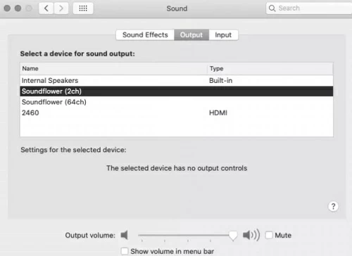 2. 將 Soundflower 設置為音頻輸出設備。為此,請轉至系統偏好設置 > 聲音 > 輸出。 Soundflower (2ch) 和 Soundflower (64ch) 均出現在可用於聲音輸出的設備列表中。對於普通用戶來說,選擇Soundflower(2ch)就相當不錯了。