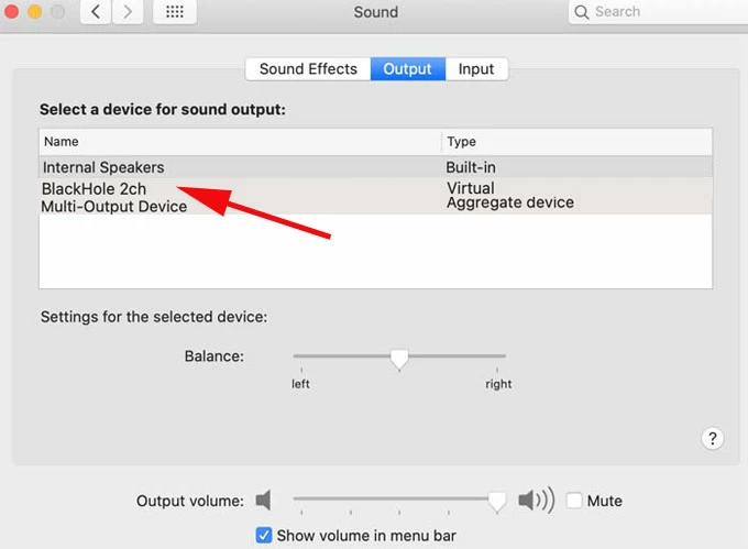 接下來,單擊蘋果屏幕右上角的圖標,然後選擇聲音偏好。點擊聲音 > 輸出,然後會出現以下頁面: