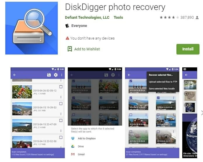 談論從Android恢復照片和視頻時,Diskdigger可以正常工作,並且能夠快速搜索可恢復的數據。您需要將設備紮根以掃描設備的內存中是否有任何丟失的數據,而應用程序通過搜索緩存和縮略圖在未根的Android上恢復照片。