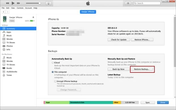 3. 從 iTunes 恢復 iPhone 6s (Plus) 照片
