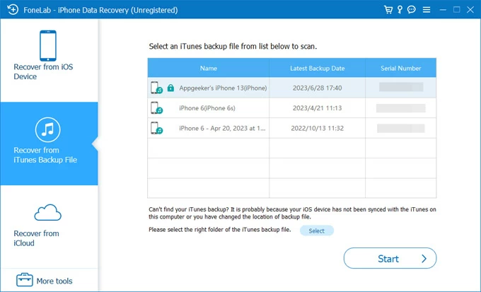一些用戶不喜歡從 iCloud 或 iTunes 備份恢復已刪除的 iPhone 照片,因為這些方法可能會覆蓋其設備上當前的照片和視頻。在這種情況下,iOS 數據恢復中內置的 iPhone 備份提取器會非常有幫助。它允許您訪問存儲在計算機上的 iTunes 備份、查看特定文件以及僅恢復您選擇恢復的照片,從而避免 iPhone 上的數據覆蓋。