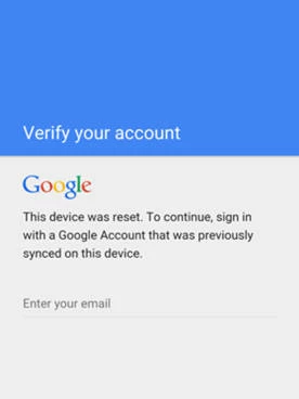 FRP 鎖是 Android 5.1 Lollipop 中首次引入的一項安全功能。它會在 Google 帳戶添加到 Android 設備後立即自動啟用,並在實施不受信任的重置後觸發,如“驗證您的帳戶”屏幕所示。這意味著您必須輸入正確的 Google 登錄信息以取消 Google 帳戶驗證,然後才能登錄並使用該設備。