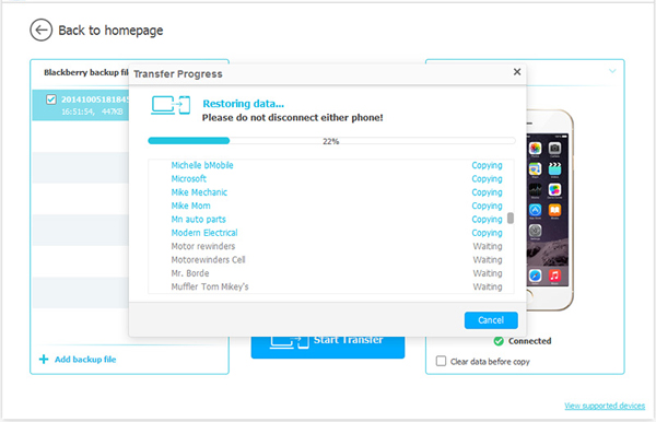 步驟2。直接點擊主屏幕上的“備份還原”功能,然後選擇要同步到新iPhone的備份。在這裡,我們將以BlackBerry備份為例。直接在功能區域中選擇“ BlackBerry”,您將看到一個新窗口,如下所示: