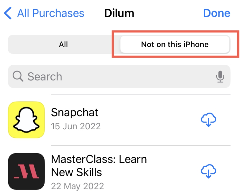 第 4 步:點擊“不在本 iPhone 上”。這將顯示您設備上當前未安裝的所有以前的應用程序。這些應用程序會按下載/購買日期自動按降序排序。因此,您可以假設列表頂部的應用程序最近已被刪除。