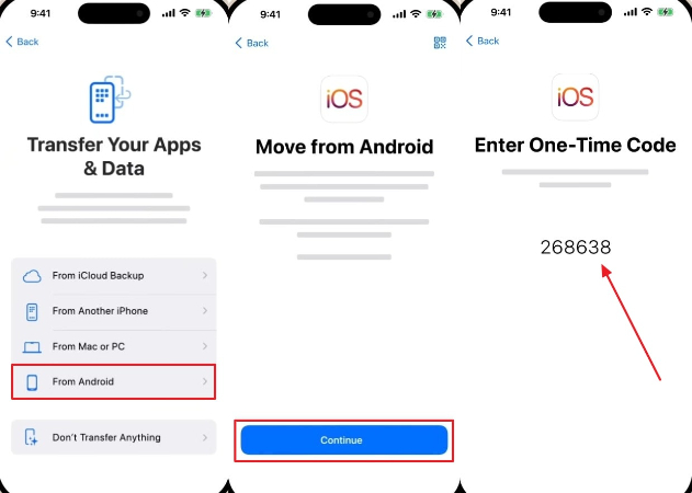 步驟1在 Android 手機上安裝 Move to iOS 應用程序,然後在設置 iPhone 時,從“傳輸您的應用程序和數據”屏幕中選擇“從 Android”選項。接下來,按“繼續”按鈕並創建一個 6 位數代碼。
