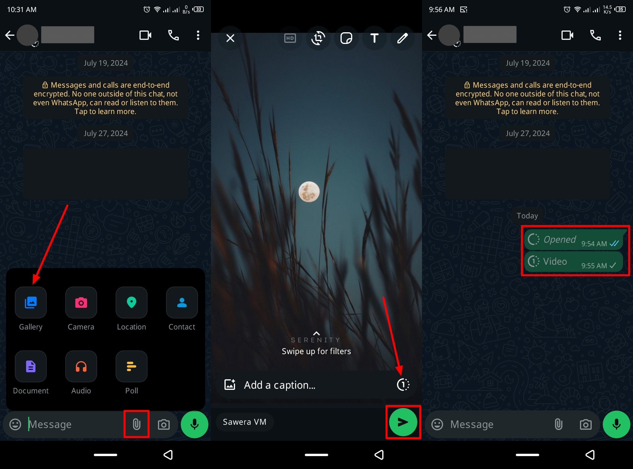 指示:在 Android 上打開 WhatsApp,然後點擊“消息”框中的“附件”圖標。現在,在打開的菜單框中選擇“圖庫”圖標,然後選擇任何圖像或視頻。接下來,按“添加標題...”框中的“查看一次”圖標,然後單擊“發送”按鈕。