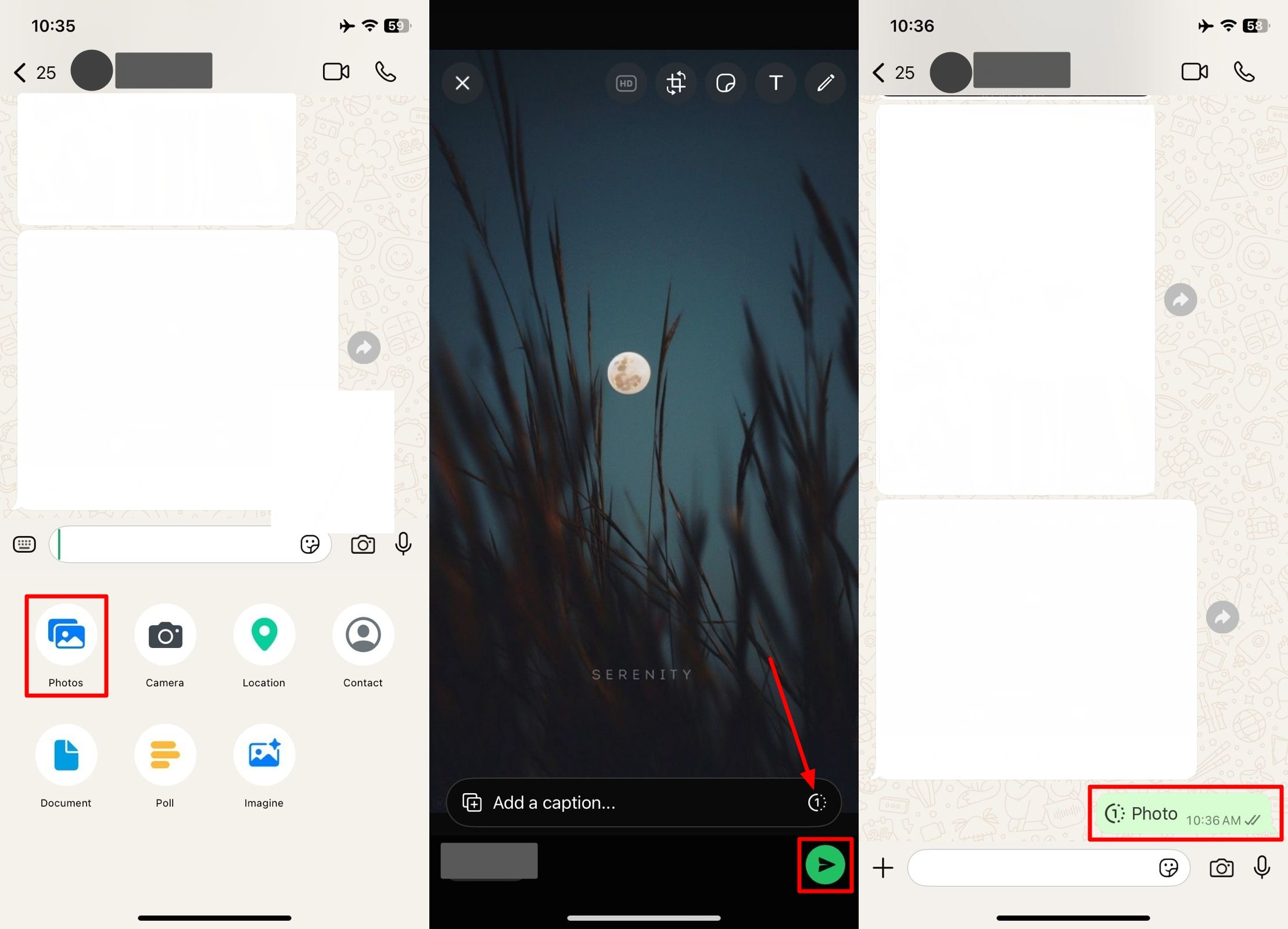 指示:在您的 iPhone 設備上,前往 WhatsApp 消息並按“媒體”圖標以顯示新的媒體菜單。從這裡,選擇“照片”選項,然後從手機的圖庫中選擇照片和視頻。現在,點擊“查看一次”圖標,然後按“發送”按鈕發送消息。
