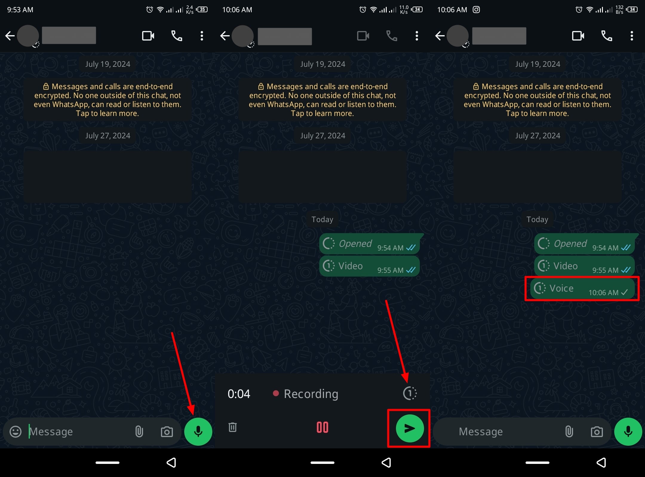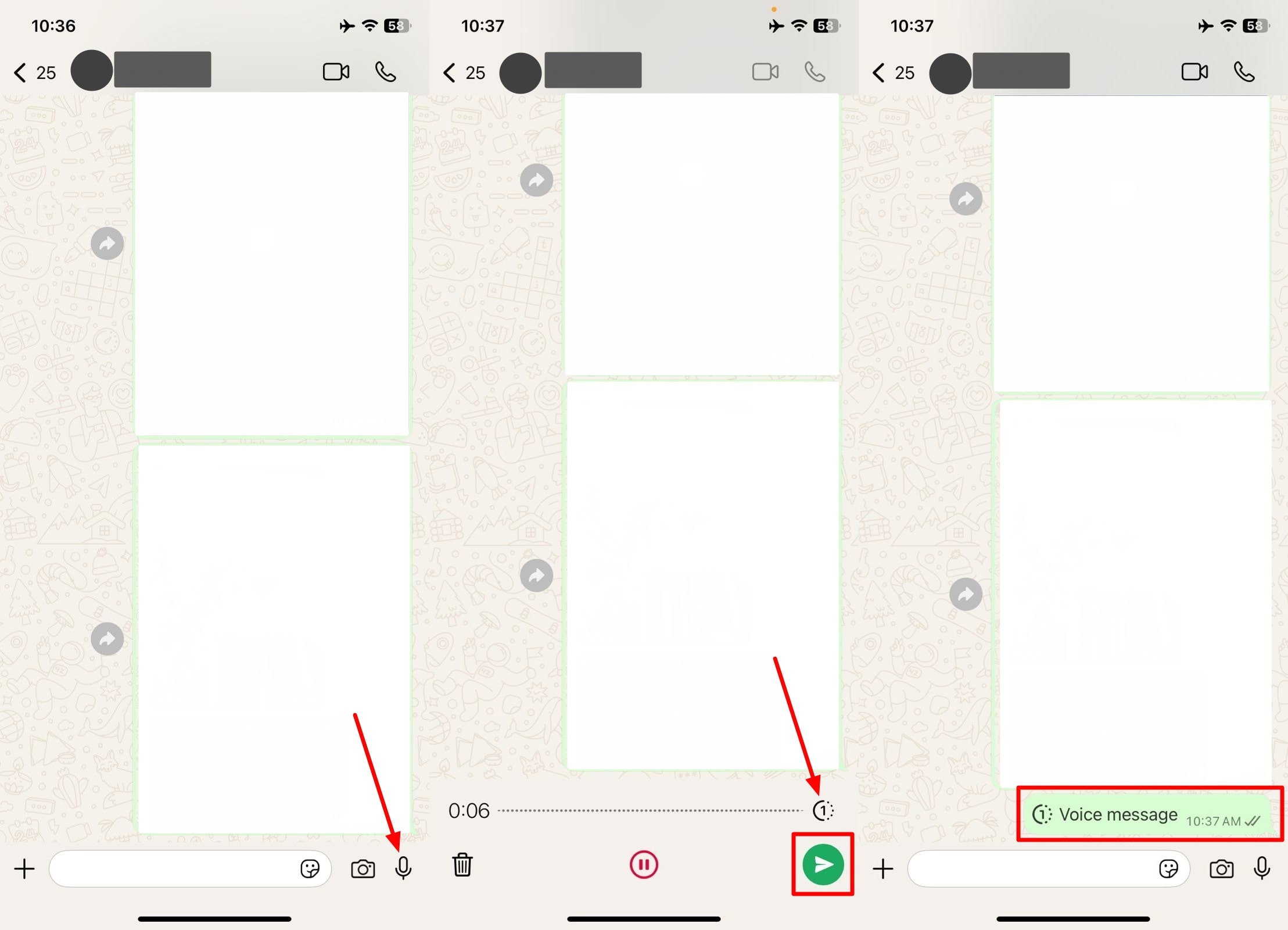 指示:前往 WhatsApp 並按住屏幕右下角的“麥克風”圖標。錄製語音消息時,點擊“查看一次”圖標,然後按“發送”按鈕。
