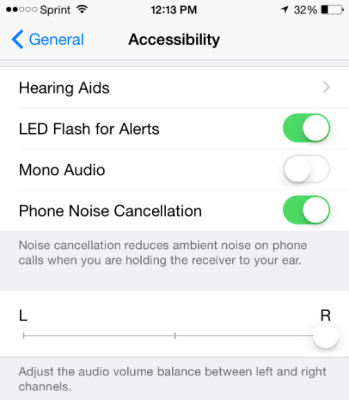 3. 前往主屏幕,然後點擊設置 > 常規 > 輔助功能 > 助聽器按鈕。然後你會看到如下界面。打開助聽器,揚聲器音量將會增大。但您應該知道,電話噪音消除將自動關閉。