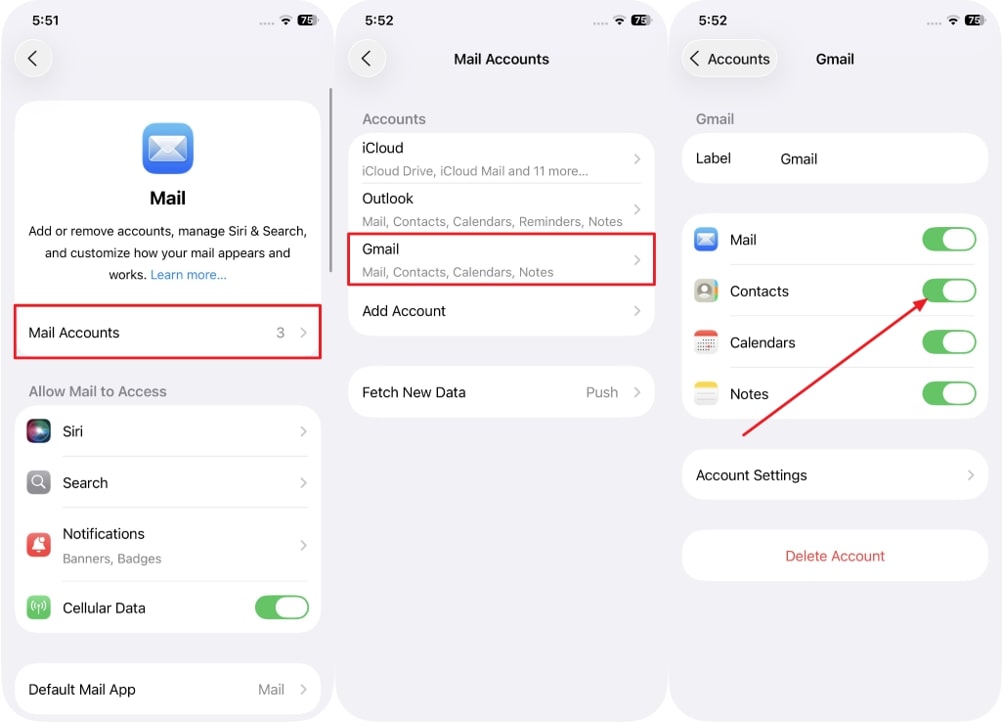 步驟3在 iPhone 上,打開“設置”,轉到“郵件”,然後點擊“郵件帳戶”選項。選擇“Gmail”選項或使用“添加帳戶”選項使用同一 Google 帳戶登錄,然後啟用“聯繫人”開關。您的 Android 聯繫人現在將自動顯示在您的 iPhone 上。