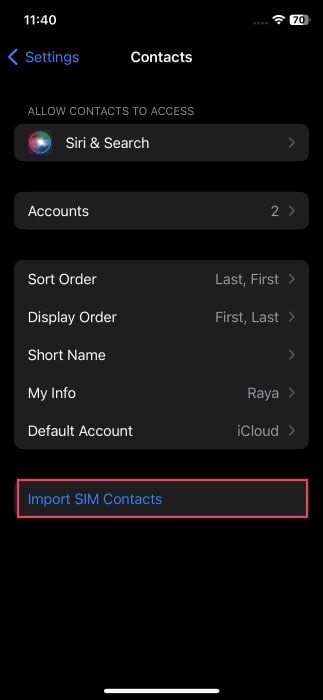 步驟2從 Android 設備中取出 SIM 卡並將其插入 iPhone。設備打開後,依次轉到“設置”、“聯繫人”,然後點擊“導入聯繫人”將所有保存的號碼導入您的 iPhone。