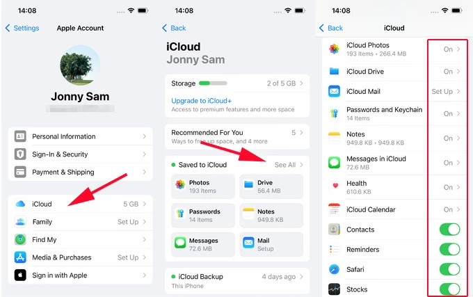 當您通過設置階段並且沒有將 iPhone 數據傳輸到新的 iPhone 17 時,另一種設備到設備傳輸解決方案是利用 iCloud 同步,以便一切都與您習慣的完全一樣。在新 iPhone 17 上啟用 iCloud 同步以從舊 iPhone 傳輸應用程序和數據,應該可以在靈活設置後輕鬆將 iCloud 傳輸到新 iPhone。這支持特定的數據類別,例如照片、筆記、聯繫人、日曆、提醒、電子郵件等。