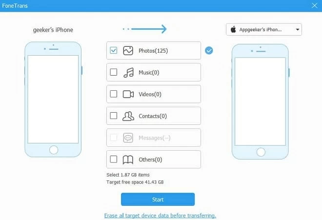 為了在不重置或 iCloud 的情況下順利傳輸數據,專用的 Appgeeker iPhone Data Transfer 是一個不錯的選擇。它為那些希望在 iOS 初始設置後快速將所有內容(如照片、音樂、視頻、消息、聯繫人等)從舊 iPhone 遷移到新 iPhone 的用戶提供了首選解決方案。