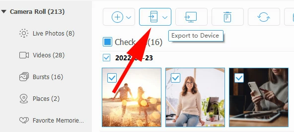 4. 選擇後,單擊導出到設備頂部工具欄中的 圖標即可立即將數據從舊 iPhone 傳輸到新 iPhone 17。