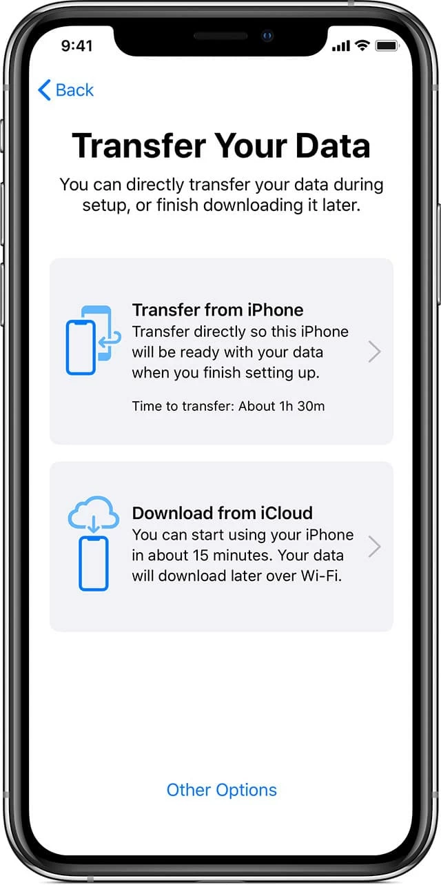 或者,如果您保留了當前設備的 iCloud 備份,您也可以選擇從 iCloud 下載“傳輸您的數據”屏幕上的選項可簡化如何使用 iCloud 將數據從 iPhone 傳輸到 iPhone 的過程。