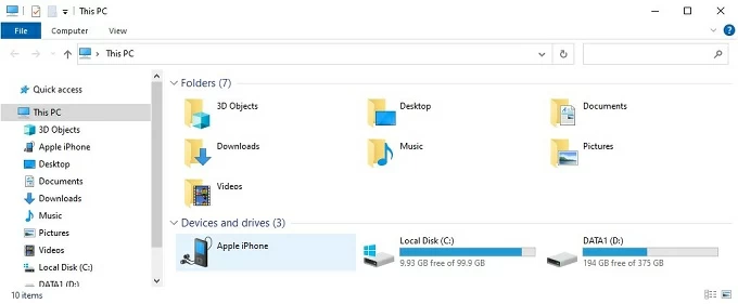 文件資源管理器內置於 Windows PC 中,是用於將照片從 iPhone 17 傳輸到計算機的另一種有線選項。通過可信的物理連接,文件資源管理器將您的 iPhone 識別為外部 USB 驅動器,以便您可以訪問其內部存儲並通過簡單的複制粘貼將照片移動到您的計算機。
