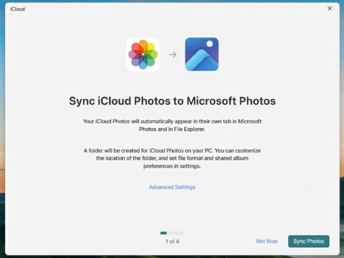 3. 當您看到“將 iCloud 照片同步到 Microsoft 照片”嚮導時,單擊同步照片在右下角。