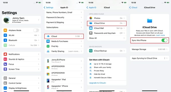 5. 確保您的 iPhone 上啟用了 iCloud Drive。前往“設置”>“[您的名字]”>“iCloud”,然後點擊“雲端硬盤”或“iCloud Drive”,並確保“同步此 iPhone”選項已打開。