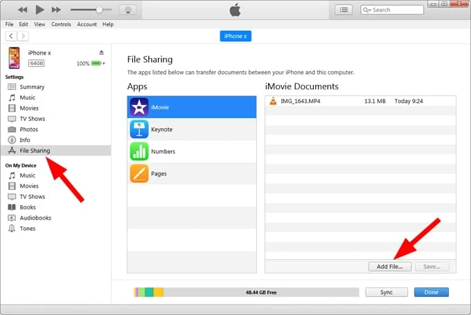 4. 將視頻移至您的 iPhone。從可用應用程序列表中選擇一個應用程序,單擊右下角的“添加文件”,然後選擇要傳輸的視頻,然後單擊“添加”按鈕。
