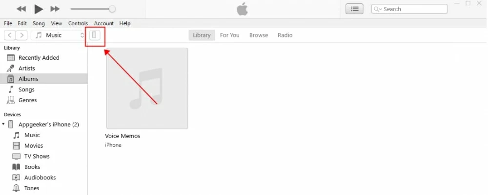 3. 點擊“設備圖標” 位於 iTunes 窗口的左上角。