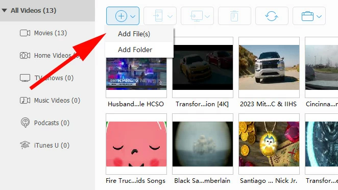 3. 將視頻從 PC 導入到 iPhone。單擊頂部任務欄上的“加號”圖標,選擇“添加文件”或“添加文件夾”,然後在彈出窗口中選擇包含所需視頻的視頻文件或文件夾,然後單擊“打開”開始將視頻添加到iPhone。