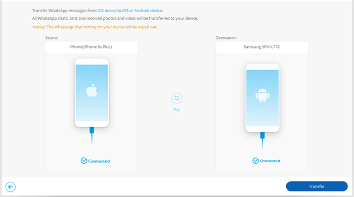 您將看到兩個設備並排顯示。您的 iPhone 應該是源設備,而 Samsung 應該是目標設備。如果沒有,則需要點擊界面中間的“翻轉”按鈕。