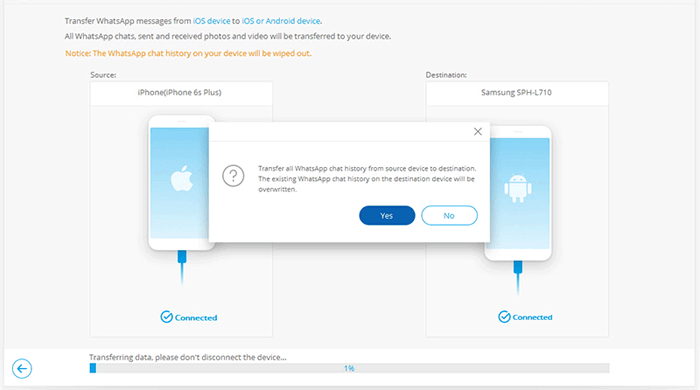 只需單擊“傳輸”按鈕即可啟動 WhatsApp 消息傳輸。傳輸完成後,點擊“恢復”按鈕將 WhatsApp 數據恢復到 Galaxy。