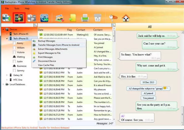 BackupTrans 提供創新且省時的解決方案,用於在手機之間查看和傳輸 WhatsApp 數據。您可以傳輸整個 WhatsApp 數據或移動單個聊天記錄。該應用程序易於使用,不需要 root/越獄訪問權限。它支持iOS 版本 4 至 15以及大多數 Android 手機,包括華為、三星和 HTC。看看它是如何運作的: