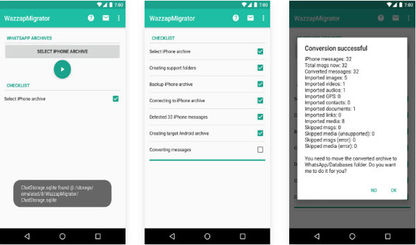 步驟 3.前往 Samsung 上的 Google Play 下載並安裝 WazzapMigrator 應用程序。然後,啟動應用程序並點擊“選擇 iPhone 存檔”選項。接下來,您可以選擇最近傳輸的iPhone備份文件,這將自動啟動傳輸。