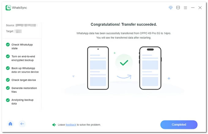 之後,Android 上的 WhatsApp 數據將立即轉移到 iPhone 17 上。完成後,iOS 設備將重新啟動。然後,您可以打開 WhatsApp 查看所有舊消息、照片、視頻、音頻、文檔等。